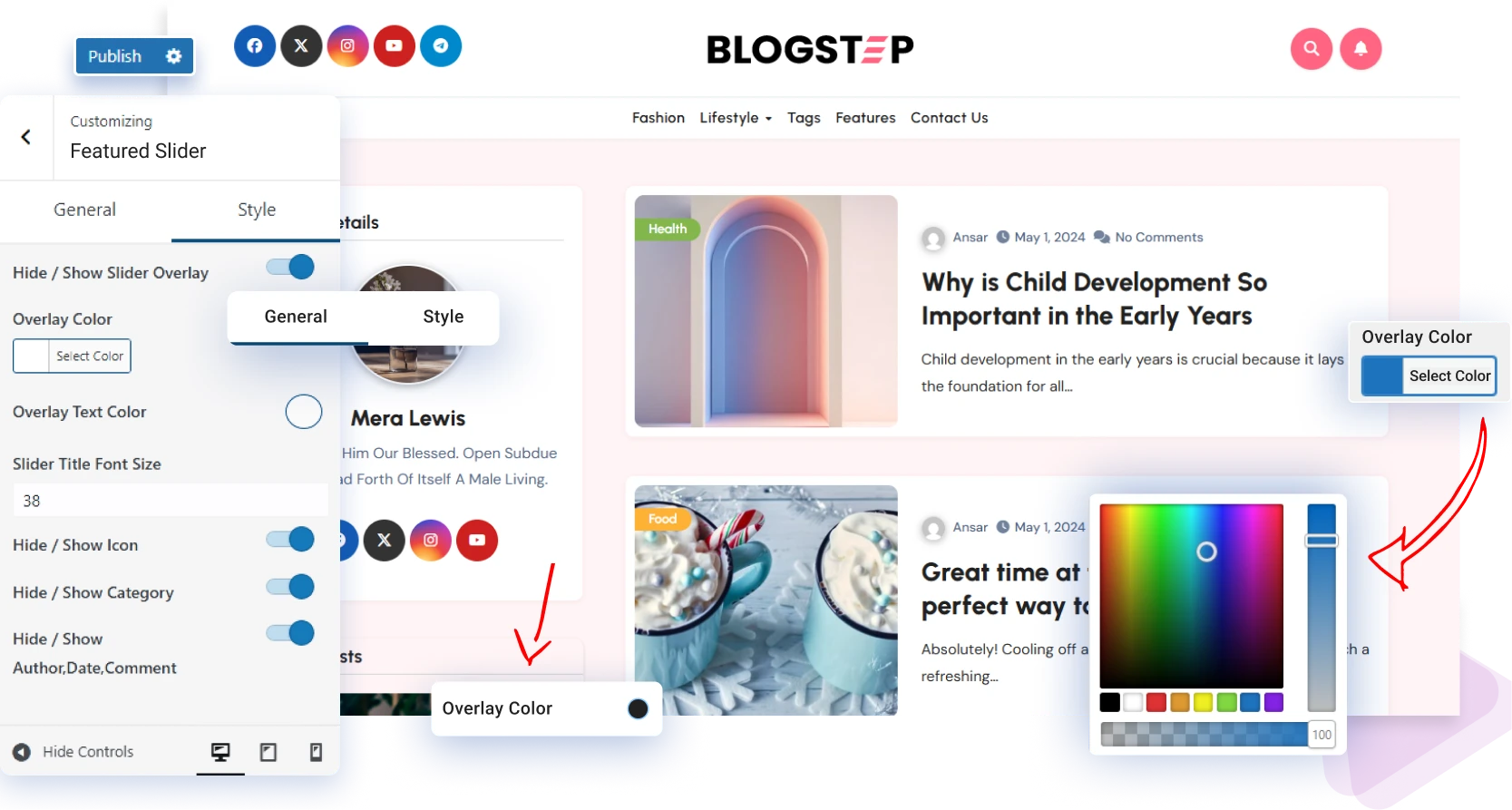 Theme has options: font family, size, weight, color, line height, letter spacing, etc